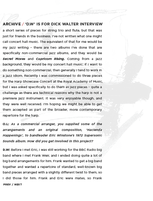 This CD served as my introduction to the talents of saxist-arranger-composer Dick Walter, and a very impressive introduction it proved to be. Each track is a Walter original, and they span a two-decade period, during which modern big band jazz has been at a premium, to say the least. As a jazz composer Dick Walter can stand alongside such worthies as Gerry Mulligan, Bill Russo, Francy Boland, Bob Florence and Bill Holman.